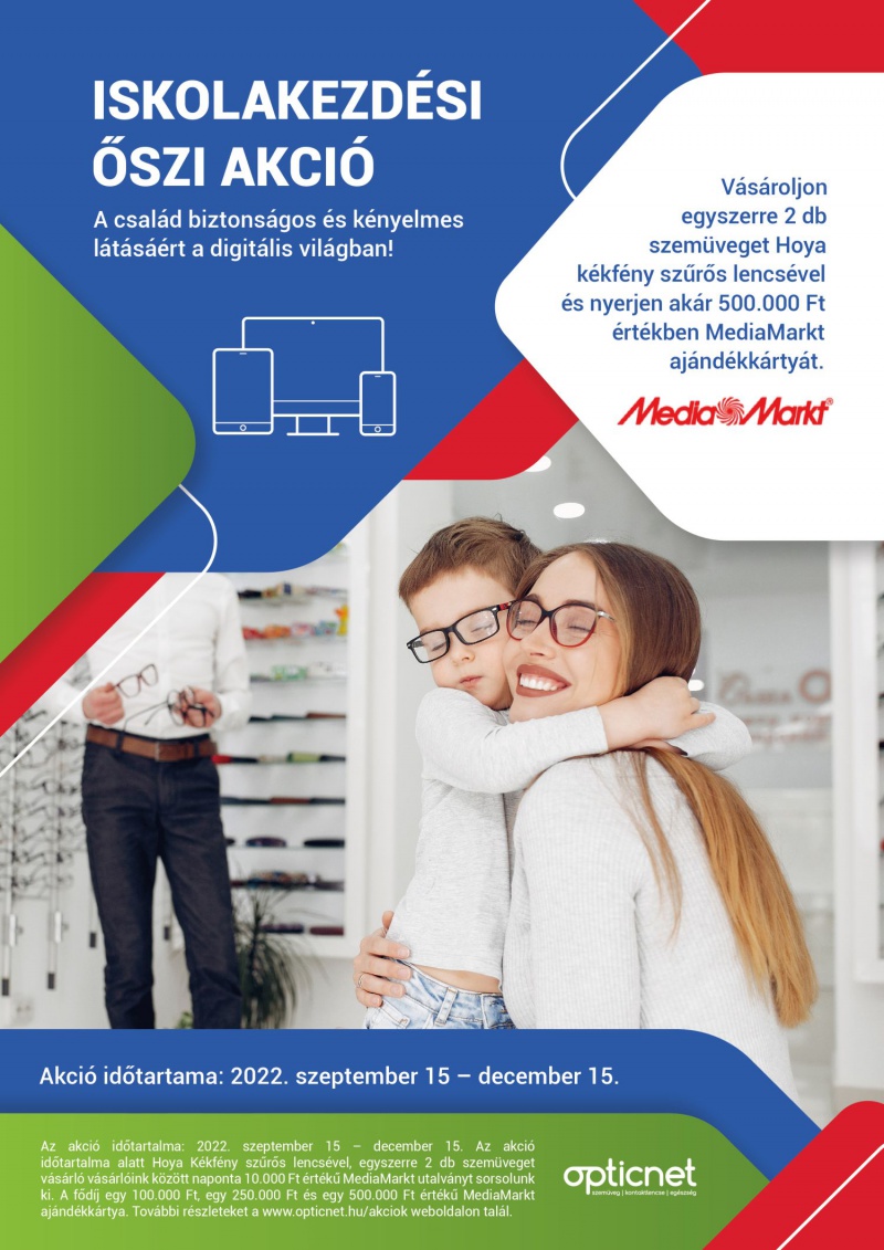 Vásároljon 2 db komplett, új szemüveget Hoya kékfény szűrős lencsével és a vásárláskor kapott kuponnal regisztráljon sorsolásunkra. A regisztrált vásárlók között az Opticnet naponta kisorsol 1db 10.000 Ft értékű MediaMarkt ajándékkártyát. A fődíjak pedig: egy 100.000 Ft, egy 250.000 Ft és egy 500.000 Ft értékű MediaMarkt ajándékkártya. A regisztrációhoz és további részletekért látogassa meg az Opticnet honlapját (www.opticnet.hu/akciok) vagy érdeklődjön Optikánkban!